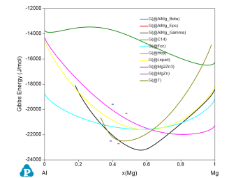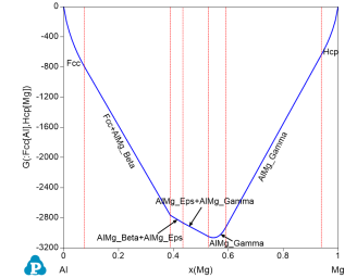 Figure 4 shows the Gibbs energy of the system as a function of x(Mg), i.e., the Gibbs energy at each composition represents the Gibbs energy of the stable phase(s) at that composition;