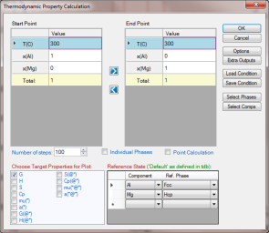 Set Calculation Condition as shown in Figure 2. The property selected is G, and the reference states are set as Fcc for Al and Hcp for Mg, the Gibbs energy of the system (stable phases in each composition range) will be calculated as shown by Figure 4;