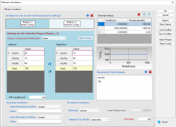 Click on the menu "PanDiffusion → Diffusion Simulation" and set up the calculation condition as shown in Figure Figure 1. First select "Region Composition Distribution" as Linear, which means that composition in each region varies linearly from the left edge to the right edge. Click on Region_1 and set the composition of the left side of the diffusion couple as 30Cr-10Fe-60Ni (at%), then click on Region_2 and set the composition of the left edge of the diffusion couple as 10Cr-20Fe-70Ni (at%), and that of the right edge as 30Cr-10Fe-60Ni (at%) (which is not shown in Figure 1).