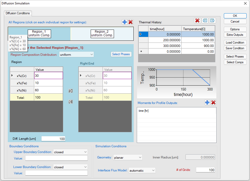Click on the menu "PanDiffusion → Diffusion Simulation" and set up the calculation condition as shown in Figure 1. First select "Region Composition Distribution" as Uniform, which means that composition in each region is uniform before diffusion. Click on Region_1 and set the composition of the left side of the diffusion couple as 30Cr-10Fe-60Ni (at%), then click on Region_2 and set the composition of the right side of the diffusion couple as 55Cr-40Fe-5Ni (at%) (which is not shown in Figure 1).
