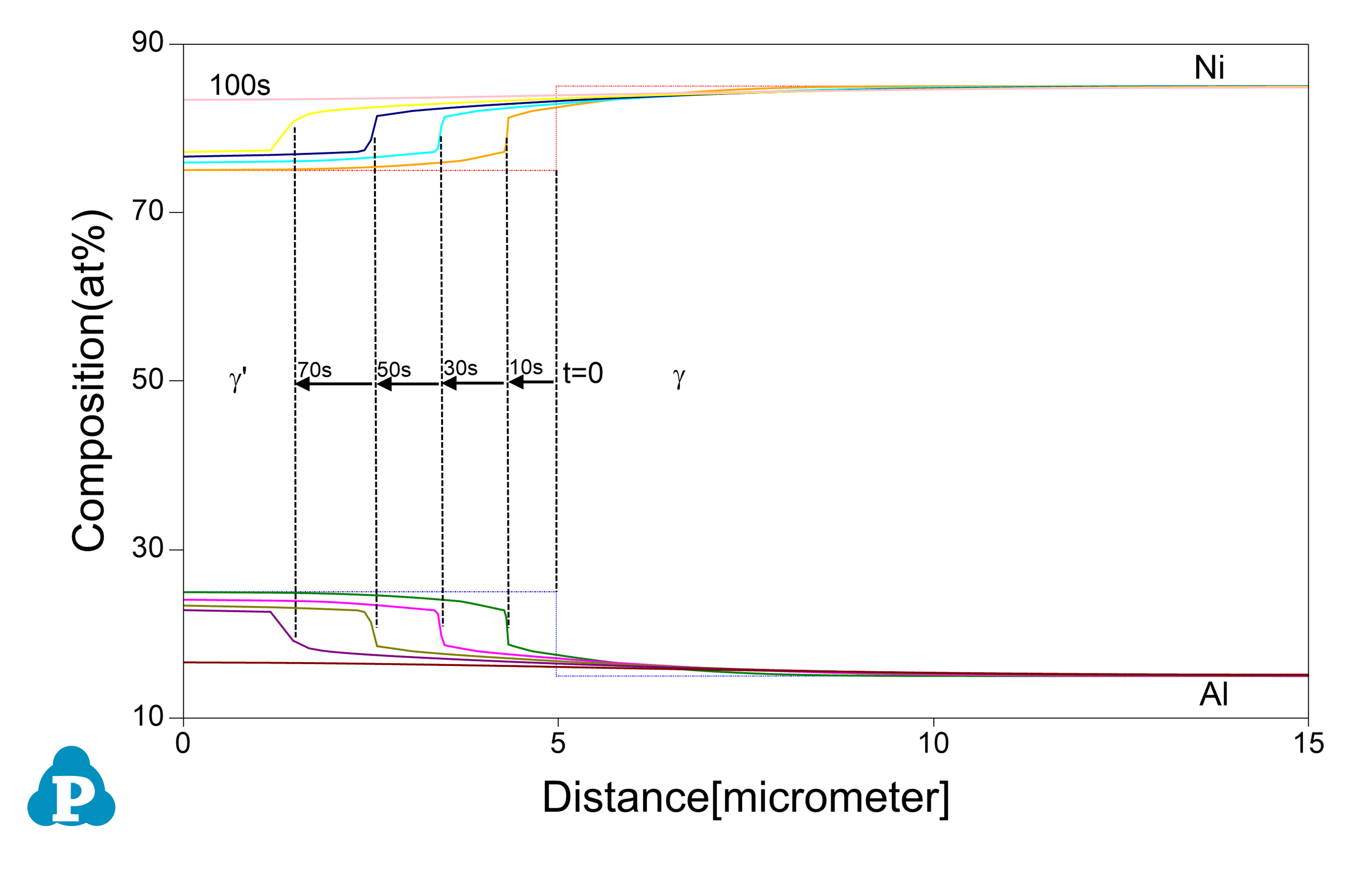 After holding the material at 1473K for 100s, composition profiles can be viewed at selected stages. The interface moving from g phase to g' indicates the dissolution of g' particles.