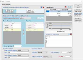 Click on Region_1 and set the composition as 25Al-75Ni (at%), and select L12_FCC as the entered phase in “Select Phases” of “Settings for the Selected Region [Region_1]”. In Region_1, set the Diff. Length as 5 um. Click on Region_2 and set the composition as 15Al-85Ni (at%) and select Fcc as the entered phase in “Select Phases” of “Settings for the Selected Region [Region_2]”. In Region_2, set the Diff. Length as 10 um.