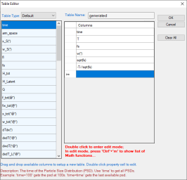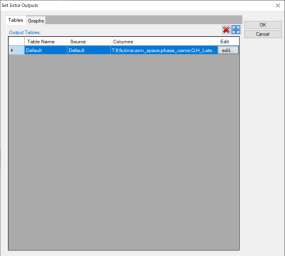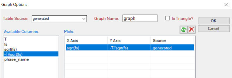 Set “Extra Outputs graph”. Click the icon “Graph” in “Set extra output” interface as shown in Figure 2, then click the blue “+” symbol to add extra Graph. An interface as shown in Figure 4 will appear. Select the “generated” table generated by the previous step. Drag sqrt(fs) from the left column to X axis in the right column; drag -T//sqrt(fs) from the left column to Y axis in the right column. Then click OK. Note that with this setting, a “graph” of -T//sqrt(fs) vs. sqrt(fs) will be plotted automatically in addition to the Default graph.