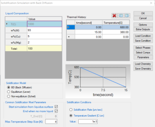 Set Solidification simulation conditions as shown in Figure 1. The alloy composition is Al-5wt.%Cu-2wt.%Mg. The cooling rate is 20 K/s is setting in Thermal History solidifying from 680 °C to 380 °C with 15 second. Temperature gradient is set as 10-3 °C/μm. Please pay attention to the units of the time and length when set conditions.