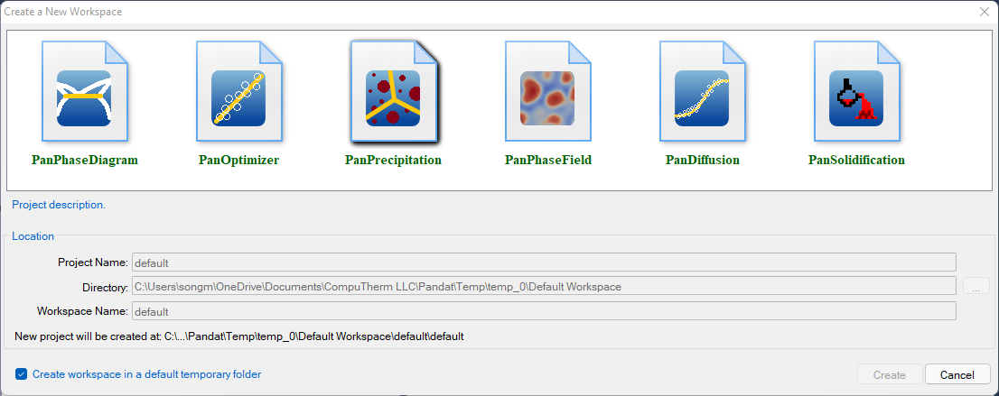 on the toolbar, or go through the menus (File → Create a New Workspace). A new window will pop out as shown in Figure 1. User can define the name of the workspace and select a working directory to put the workspace. For different types of simulation, user can then select a proper module from the six icons: Phase diagram calculation (