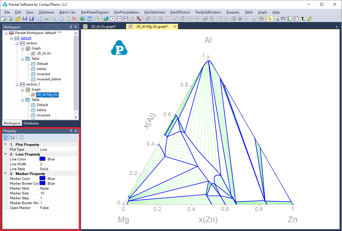 The other properties of the tie-lines, such as the color, the style, are defined by individual property window associated with these tie-lines. These properties can be modified when only the tie-lines on the Main Display window are selected and highlighted as shown in Figure 2. User can change the appearance of a set of lines belonging to the same group by selecting this line (or a group lines) only. The properties for such data plots, such as the line color, thickness, marker type, will show up in the Property window for user to modify. The data points and lines selected will be highlighted in the graph while the others will be grey. As shown in Figure 3, the phase boundary lines are selected as a group of lines to be modified in this case. The properties of this group lines are defined in the “Plot Property” window as “Blue, Solid, None marker” lines. All these properties can be modified in the Property Window as framed by the red line in Figure 3. The “Line Property” defines the property of the line and the “Marker Property” defines the property of the point on the graph.