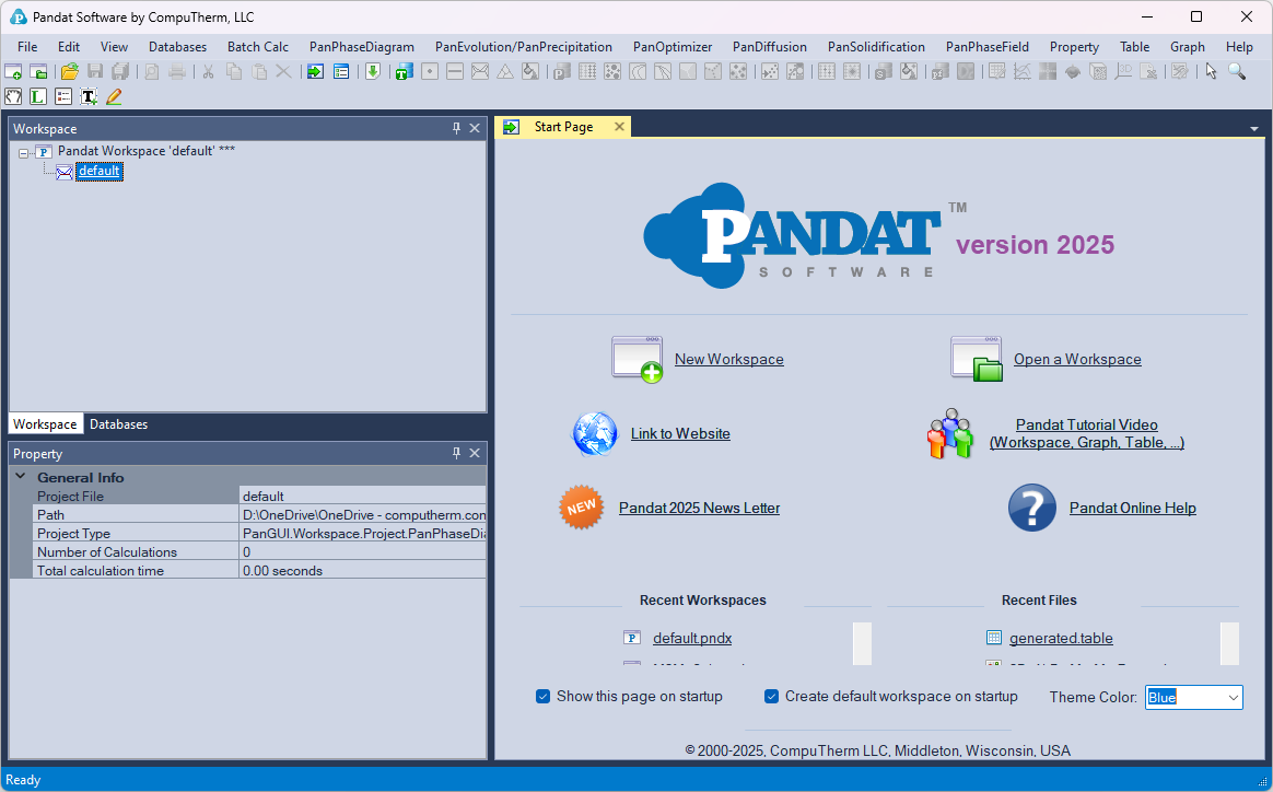 on the toolbar. On the start page, there are shortcuts which allow user to create a new workspace and open an existing workspace, link to CompuTherm’s webpage (www.computherm.com) for recent updates and for comments and discussions from Pandat user. It also lists the most recent workspaces and files the user has created, so that user can reopen them easily.