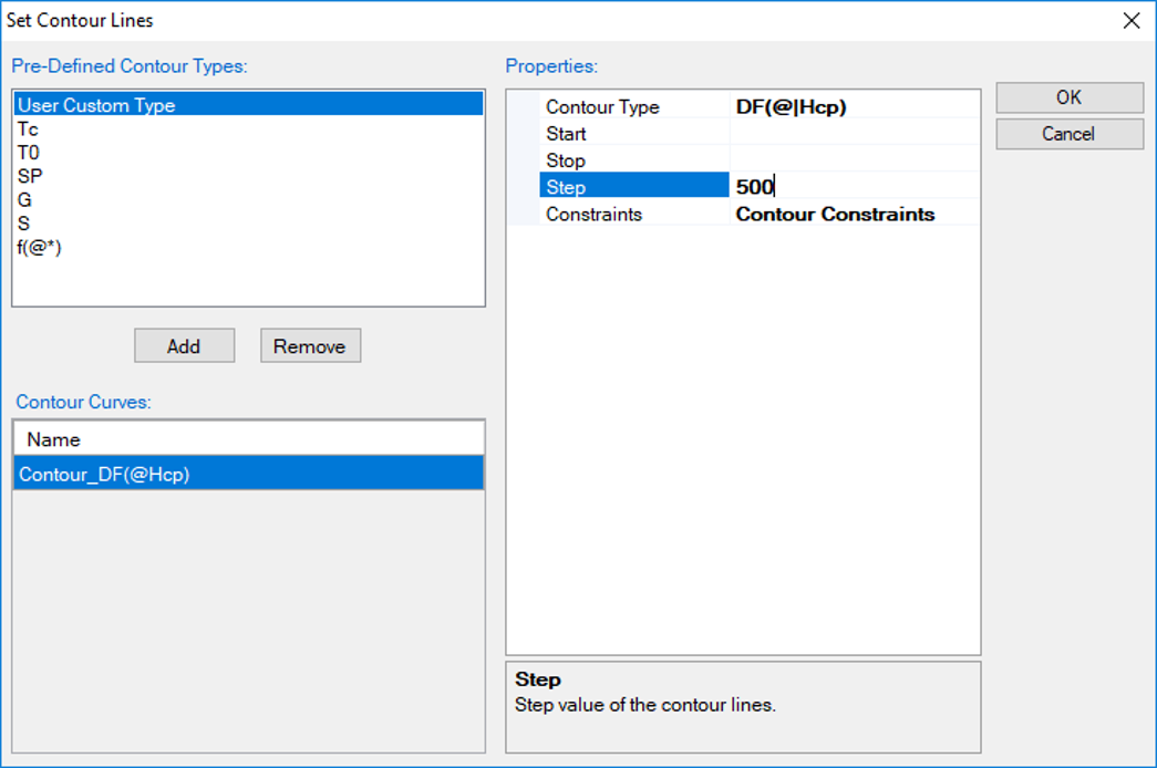 Contour diagram is also useful in viewing the stability of a phase comparing to the equilibrium state. Figure 2 shows the driving force contour lines of the Hcp phase in the Al-Mg-Zn system at 500°C. The contour type is defined as DF(@|Hcp) as shown in Figure 1 (see Table 1 in Section Pandat Table Format Syntax for the definition of DF). Since Hcp phase may not be stable in all the phase regions in this isothermal section, in between “@” and “Hcp” a vertical bar symbol “|” is added to specify that the phase Hcp is in the “entered” status. From Figure 2, we see that Hcp phase has less driving force to be stable in the central region of the compositional triangle.