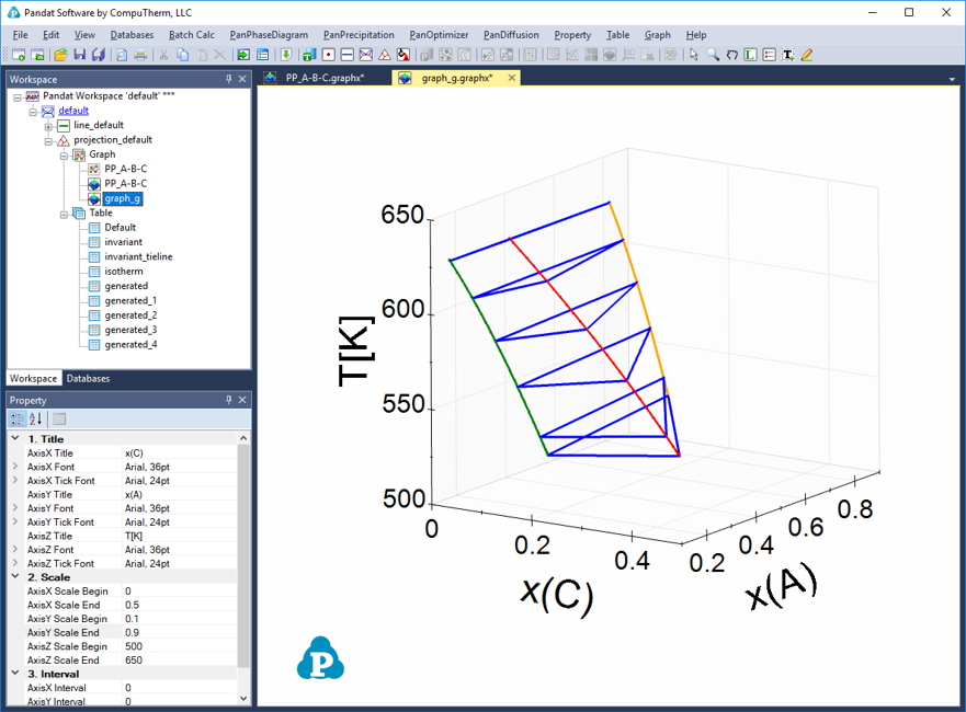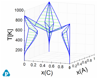 Figure 1 is a 3D ternary phase diagram calculated from the database file “ABC.tdb” which is provided in the PandatExamples folder. This system has three binary eutectic reactions. To show the invariant tielines in these binaries, set the “Show Invariant Tieline” in the Property window as “true”, then the invariant lines will be plotted on it as shown in Figure 2.