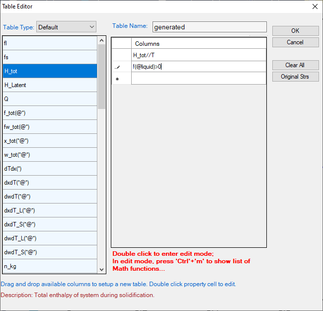 The example given here is to find the “effective heat capacity” of the system during solidification (H_tot//T). A system of Al-Mg-Zn is chosen and the composition is shown in Figure 1. After Scheil simulation is done, a new table is created with the definition of the column names shown in Figure 2. Figure 3 is the newly generated table. Select the columns “T” and “H_tot//T”, we have the vs T diagram as in Figure 4. This diagram shows the effective heat capacity change during the solidification by Scheil simulation. There are two peaks in Figure 4, which represent roughly the phase transformation from liquid to Hcp+γ and that from liquid to Hcp + τ, respectively.