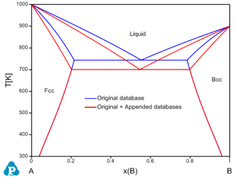 Figure 1: Calculated A-B phase diagram using both original database and original + appended databases with adjusted parameters