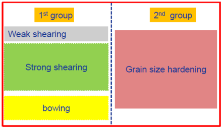 As an example shown in Figure 1, the first group has three mechanisms “weak shearing”, “strong shearing” and “bowing” while the second group has only one mechanism. This is very typical in the γ' strengthened Ni-based superalloys. The big primary γ' acts to limit grain growth during solution treatment and enhances grain boundary strengthening while the tertiary/secondary γ' particles strengthen materials through the weak/strong shearing and bowing mechanisms. In [2015Gal], Galindo-Nava proposed a unified model for weak/strong shearing and bowing mechanisms. The transitions from weak to strong shearing and to bowing are automatically taken care. The unified critical resolved shear stress τshearing is calculated as,