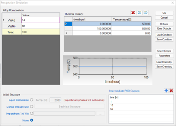 Thermal History: Arbitrary heat treatment schedule can be inputted, with a linear Time-Temperature relationship (i.e., constant cooling or heating rate) at each two consecutive rows. Time at the first row must be zero representing the initial time. The thermal history set up in the Figure 4 represents an isothermal heat treatment for 100 hours at 550 °C. If the temperatures in the two rows are different, it represents constant cooling or heating. Multi-stages of heat treatment can be set by adding more rows in the Thermal History column.
