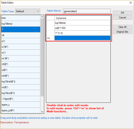 Moreover, mathematical calculation over these properties is allowed in PanEvolution. Accordingly, a variety of property diagrams can be generated based on the customized tables, which offers users an excellent flexibility for different applications. A detailed description of table format is given below. Figure 12 shows the dialog window of table editor for customized new table. The symbol “*” can be used to get quantities of all the phases or all components. As an example, s(*) retrieves the average size of phase L12_FCC, which is equivalent to s(L12_FCC).