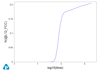 As all other calculations available in Pandat, upon the completion of the precipitation simulation, a default table with related kinetic properties (such as time, total transformed volume fraction, average size of each precipitate phase, number density of each precipitate phase and nucleation rate of each precipitate phase) is automatically generated and a default graph for volume fraction changes is displayed Figure 7.