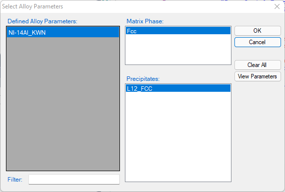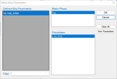 icon from the toolbar. After Ni-14Al_Precipitation.kdb is chosen, a dialog box pops out automatically for user to select the model, as shown in Figure 3, the “Ni-14Al_KWN” is chosen in this example. The Matrix Phase window allows user to select the matrix phase (Fcc in this case ) and the Precipitates window allows user to choose one or more precipitate phases of interest for simulation (L12_Fcc in this case). To select several phases at one time, press and hold the “Ctrl” key.