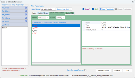 In the pre-defined alloy parameters, the matrix and the precipitate phase names are based on the demo databases used in “Pandat 2025 examples” folder and “Pandat 2025 example book” folder. One needs to make sure the phases in the pre-defined alloys are included and have the same phase name in the loaded thermodynamic and mobility database. Otherwise, users need to add the matrix and the precipitate phases parameters from the default setting. The kdb files for these pre-defined alloys are included in the folder :