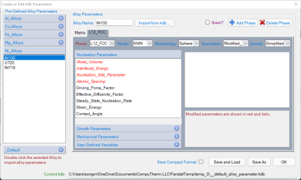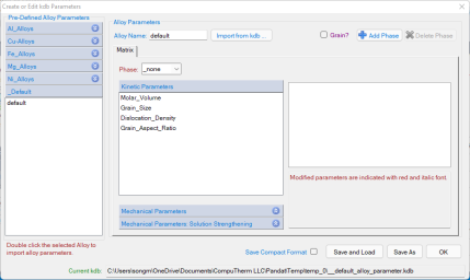 Users can check the phase names and parameters directly from these kdb files. User can also add their own kdb files in this folder, the added alloys will be automatically shown on this “Create or Edit kdb Parameter dialog”.