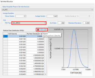 User can also define the initial structure from GUI. User first chooses the target phase to set the initial structure and then set the average quantities including the volume fraction and average size. The PSD type can be “uniform”, “normal”, “log_normal” or “user_defined”. When “normal” and “log_normal” are selected, the PSD data will be generated and the corresponding plot is shown on the right panel. In order to load a user defined PSD, the user can set PSD type to be “user_defined” and then load the PSD data file by clicking the import button. An example PSD data file “psd_test.dat” can be found in the folder: $Pandat_Installation_Folder\Pandat 2025 Examples\PanEvolution\Ni-16%Al_Dissolution\.