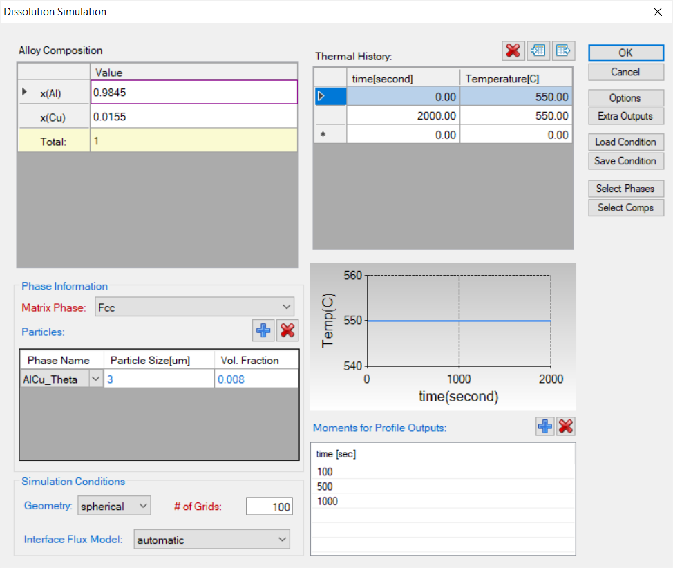 To set the above conditions in PanDiffusion, click on the Toolbar or from the menu "PanDiffusion → Dissolution Simulation", a popup window as shown in Figure 1 will allow user to set up calculation conditions. In “Alloy Composition” section, the overall composition of Al-Cu alloy is set to 98.45Al-1.55Cu (at%). In “Phase Information” section, set “Matrix Phase” as Fcc. In “Particles” subsection, click bottom to add a particle, set “Phase Name” as AlCu_Theta, set “Particle Size” as 3 µm, and set “Vol. Fraction” as 0.008. In “Simulation Conditions” Section, set “Geometry” as spherical, and set “# of Grids” as 100. In “Thermal History” section, temperature is set as 550°C, and heat treatment duration is set as 2000 seconds.